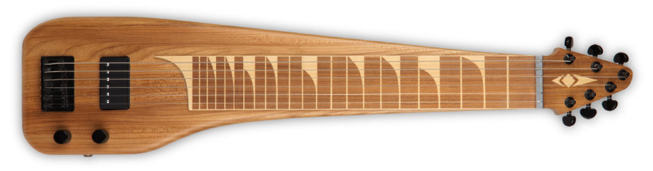 Diese Lapsteel Gitarre wurde aus Ulmenholz mit Ahorn und Nussbaum Intarsien gefertigt.